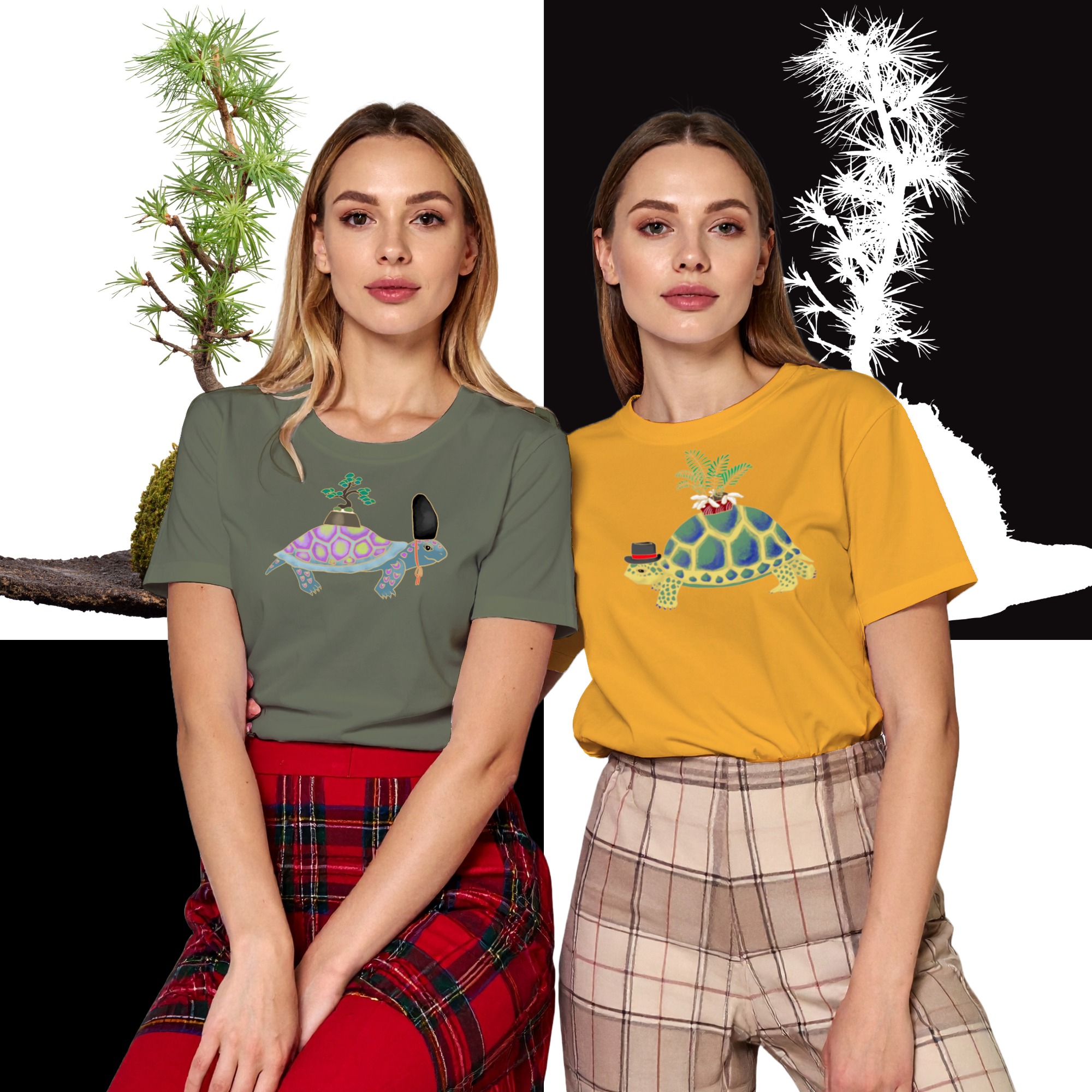 Hello! We’re thrilled to unveil our brand-new classic Bonsai Tortoise T-shirt. We’re excited to add it to our lineup! With this release, you can choose between two designs: “Eboshi-Clad Turtle & Goyō-matsu Bonsai” and “Silk-Hatted Tortoise & Hare’s-Foot Fern Bonsai.” The photo above shows our commemorative twin-tee coordination!