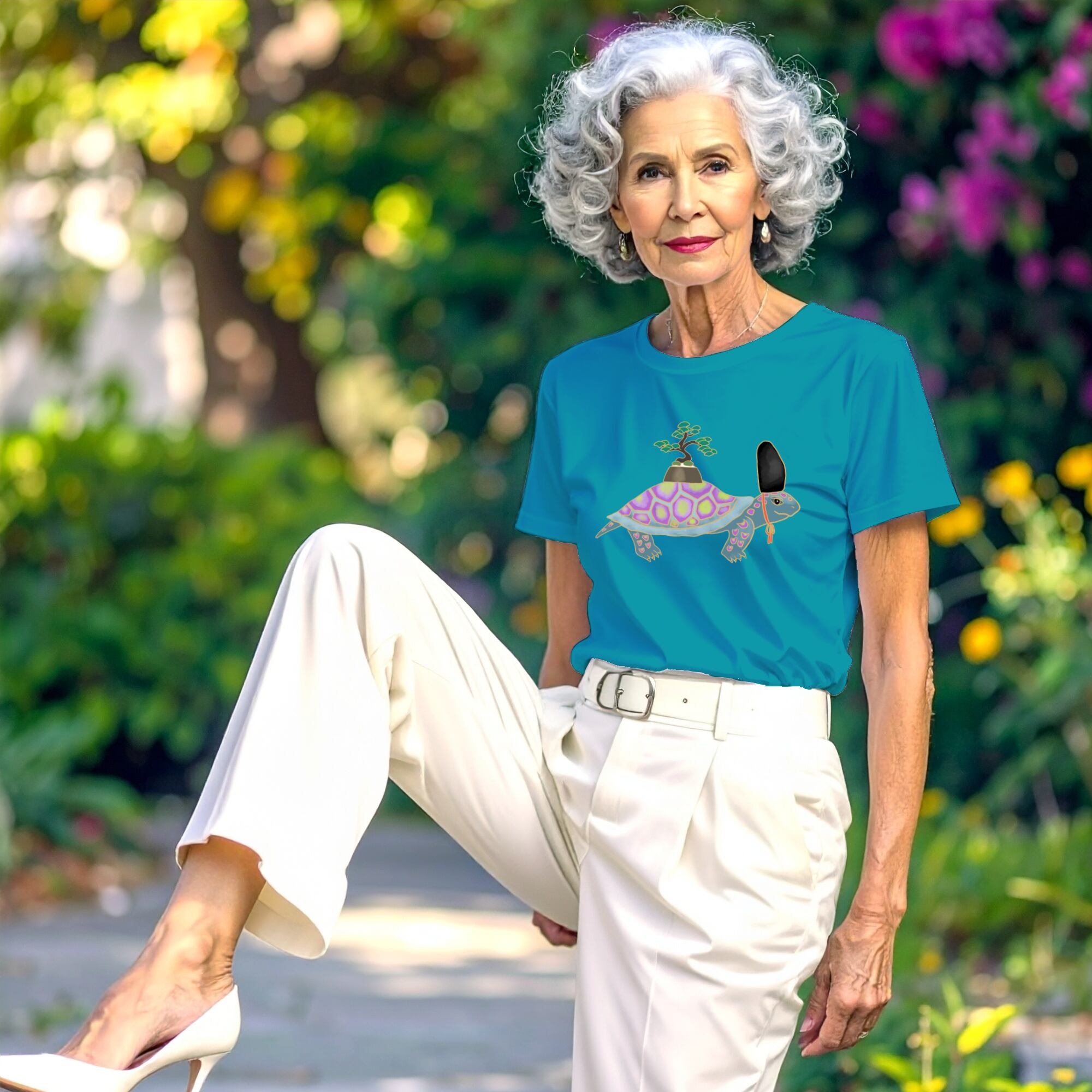 This unisex T-shirt features a charming “Bonsai Turtle” bearing a Japanese white pine bonsai ( Goyo-matsu bonsai , the so-called king of bonsai) atop its shell, and wearing a traditional Japanese eboshi hat. Rendered in gold line art with Art Deco–inspired patterns and pots, it comes in five “Bonsai-turtlegenic” colorways. An original logo graces the back.