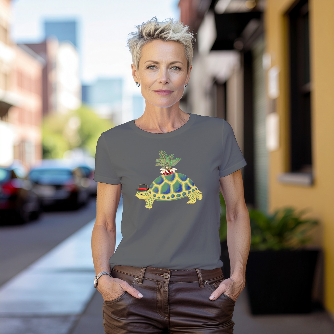 This unisex T-shirt features a charming “Bonsai Tortoise” bearing a Tokiwashinobu bonsai (Hare’s Foot Fern, prized for its soft, fuzzy fronds) atop its shell and wearing a silk top hat. Rendered in gold line art with Art Deco–inspired patterns and pots, it comes in five “Bonsai-tortoise-genic” colorways—each inviting you to imagine a fresh Tortoise & Hare tale. An original logo graces the back.