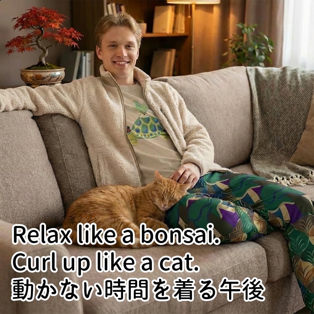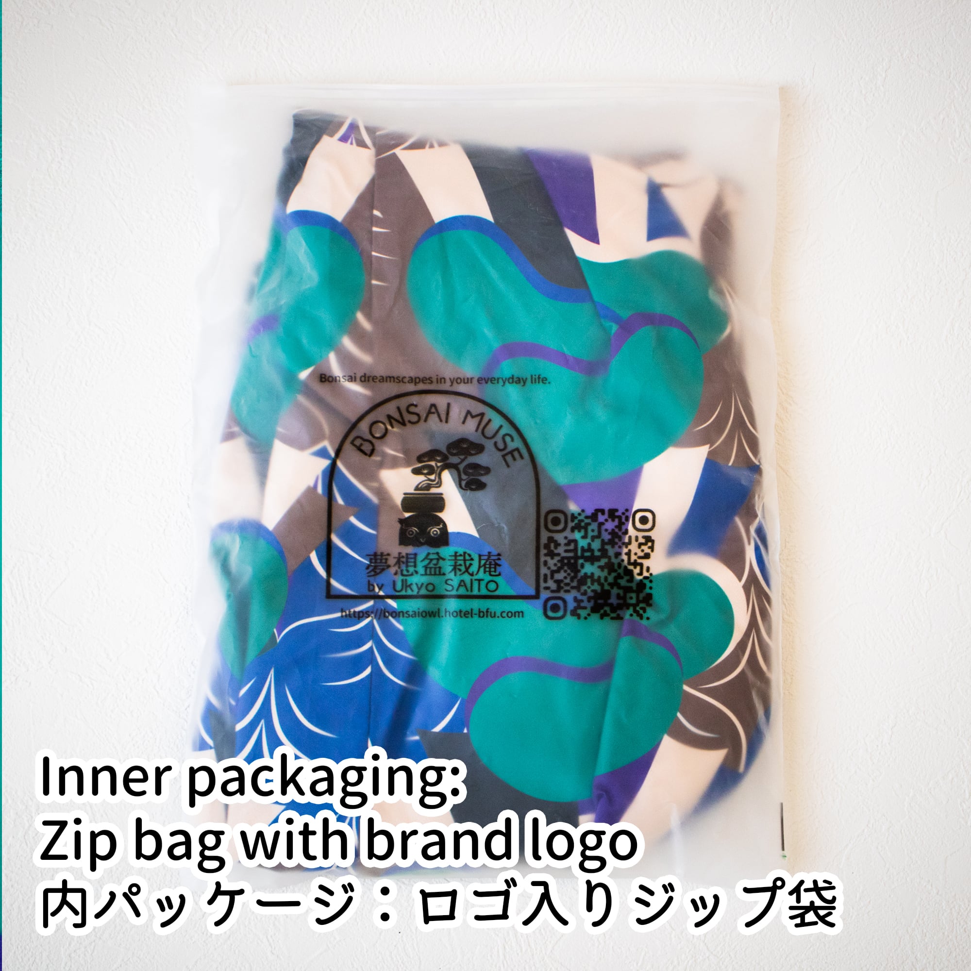 盆栽をイメージした2種類のパターン「松の枝」「広葉樹の葉」を組み合わせた、Bonsai Muse オリジナル総プリントのジョガーパンツ。緑、青、紫、茶、黒の5色で、落ち着いた色ながら主役級のインパクトです。名付けて、盆栽迷彩。盆栽のお手入れウェアとしてはもちろんのこと、リラックスシーンに、アウトドアに、ミックステイストのファッションやストリートファッションにおすすめです。
